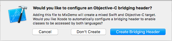 New or add exist Swift file into the project. Then Xcode pop-ups a dialog, follows image. We just click “Create Bridging Header” to automatically crate bridging header. After that, we can see the bridging header file which be names your product name followed by adding "-Bridging-Header.h".