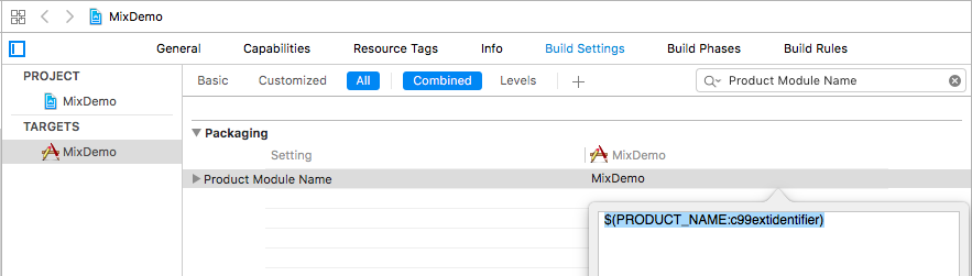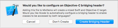 Finally, we need to import “MixDemo-Swift.h” to any Object-C .m. That header is created by Xcode, but you cannot see in the project folder. The file names your Product Module Name, which we mentioned above, followed by add “-Swift.h”. You can also search "Objective-C Generated Interface Header Name" under Build Settings.